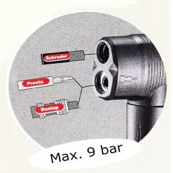 Avec une pression de 4 bar / 58 PSI, ce gonfleur compatible avec les valves Presta et Schrader rempli en une minute les pneus de vélo, moto, voiture mais aussi les matelas pneumatiques, bouées et ballons de plage et d’entrainement. Les deux roues se gonflent en 3 minutes avec une pression de 2.5 bar / 36 PSI.