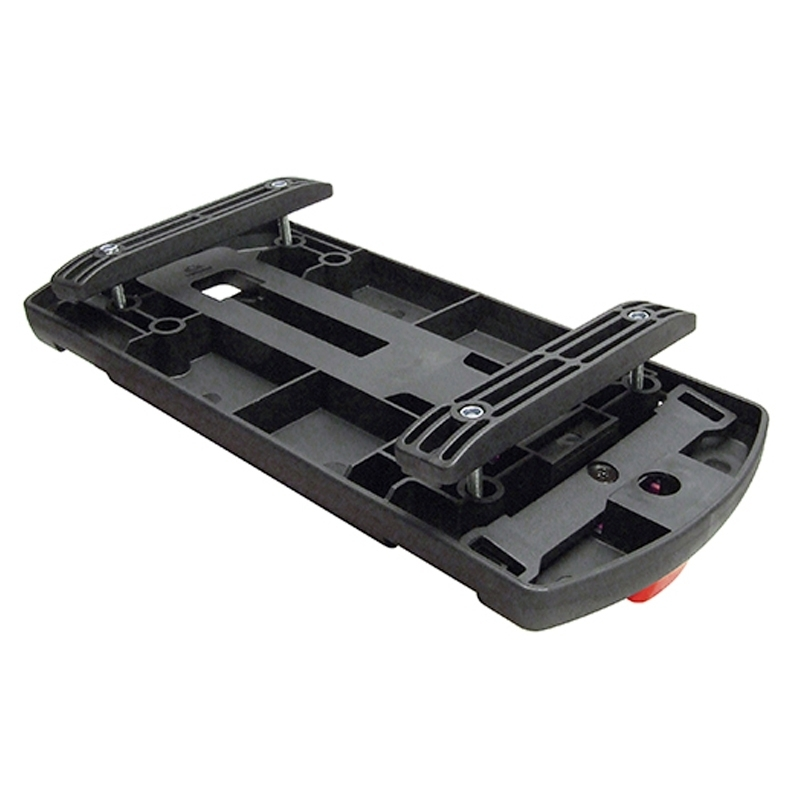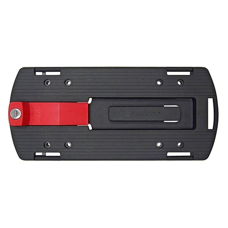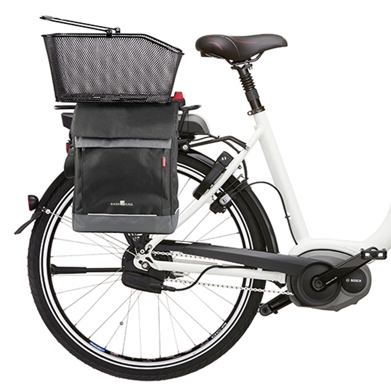 Tous les accessoires compatibles peuvent être fixés via la barre centrale et décrochés facilement en appuyant sur le bouton rouge. Les paniers et top cases (avec fixation KLICKfix sur le fond) viennent se fixer sur la partie centrale de l’adaptateur. Des sacoches peuvent être suspendues par les points d’ancrages sur le côté.
