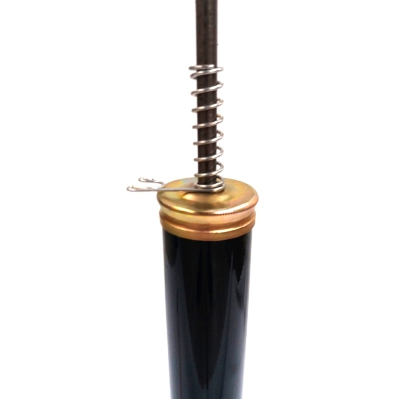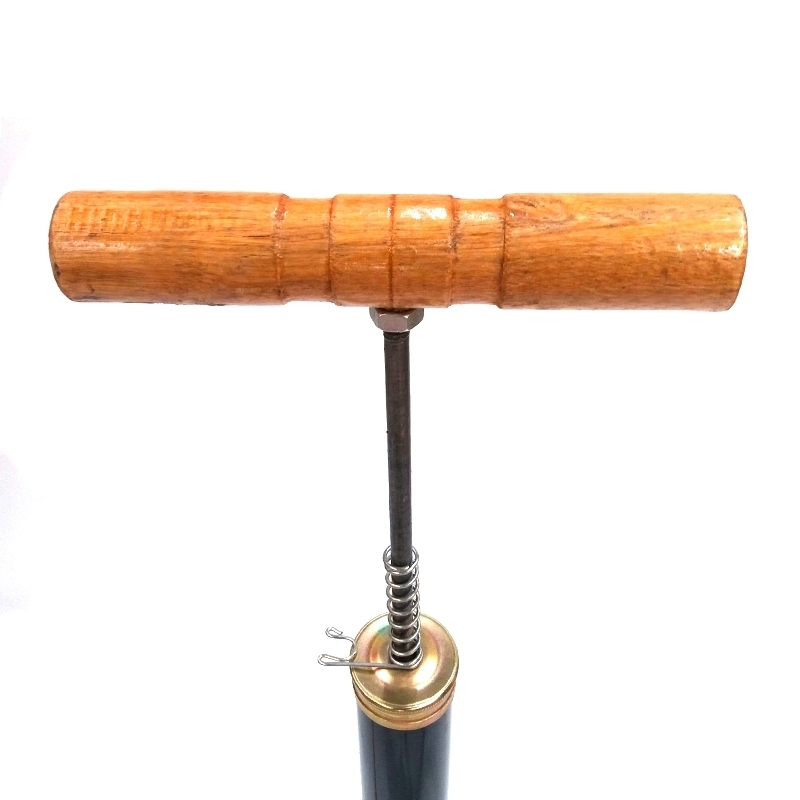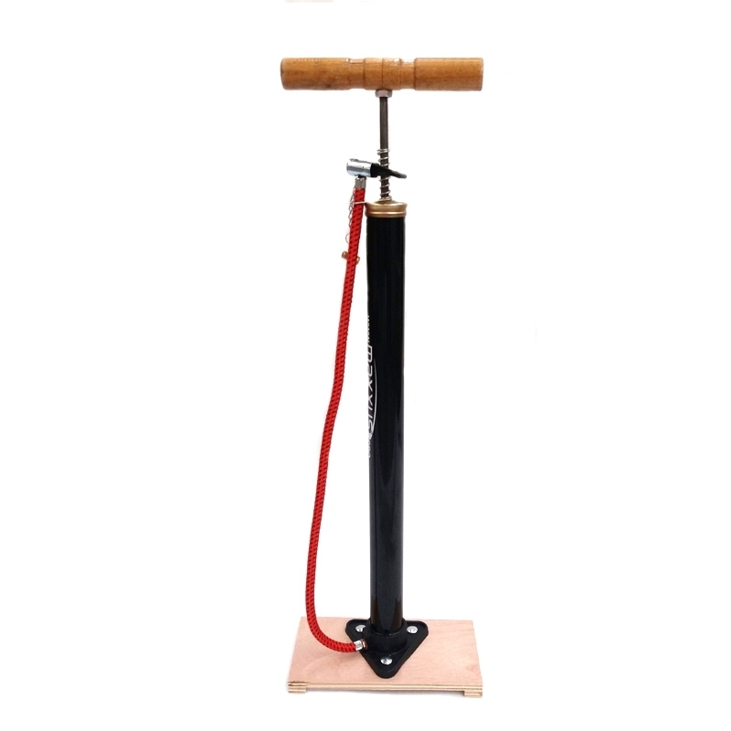 Sa large poignée en bois et son ressort de retenu pour tenir le tuyau et la tête de gonflage offre un bon maintien de l’ensemble.