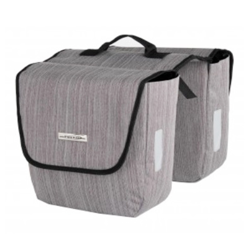 Cette sacoche double en polyester de couleur grise se ferme à l’aide de velcros et se fixe sur le porte bagage arrière de votre vélo à l’aide de sangles.