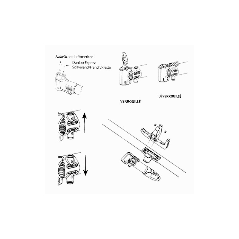 Cette mini pompe haute pression dispose d’une tête double tête brevetée pour valve Schrader, Presta et Dunlop à enclenchement rapide. Avec sa poignée pivotante et son support de cadre, la pompe de vélo se range facilement en prenant un minium de place.