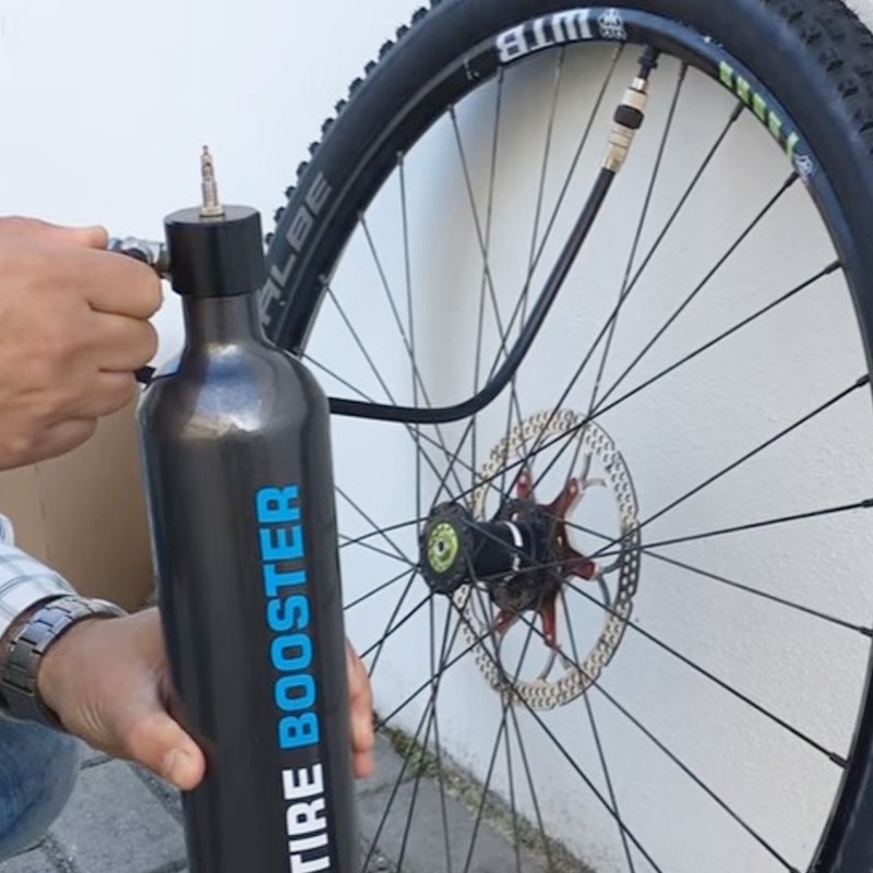 Pour un montage fiable et aisé sans compresseur, Schwalbe propose le Tire Booster, une réserve d’air sous forme de bidon en aluminium qui permet de gonfler rapidement le pneu avec une pression allant jusqu’à 11 bars. Le pneu adhère ainsi immédiatement à la jante et assure une étanchéité totale et uniforme.