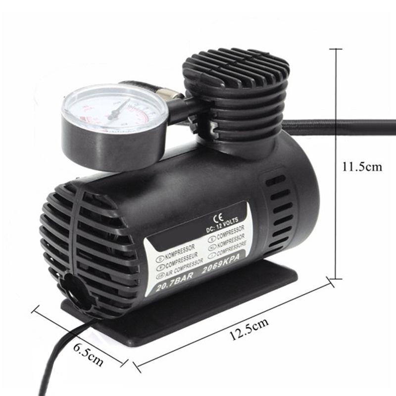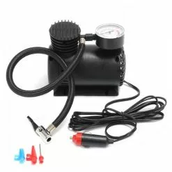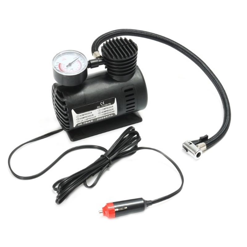 Mini compresseur, idéal pour gonfler pneus, canots et accessoires de sport. Livré avec prise pour allume-cigare de 12V/CC et un câble de 2,8 m, 2 adaptateurs de gonflage et 1 adaptateur à aiguille.